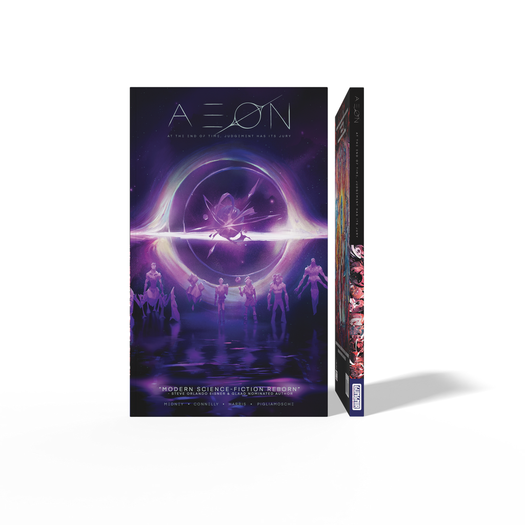 “a sprawling sci-fi epic! Aeon asks the fundamental question, Who are we? Medney, Connelly & Harris with the art of Pigliamosche created the modern day Sandman, esoteric ideas wrapped inside an out-of-this-world (and outside of space time) setting.”